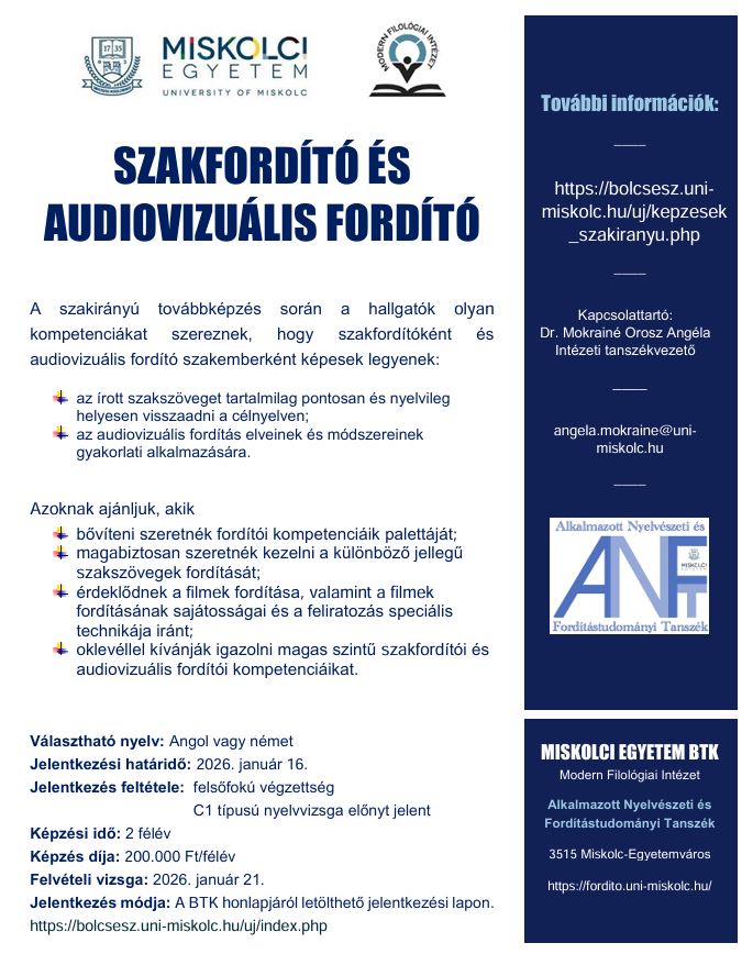 Jelentkezz a Szakfordító és audiovizuális fordító keresztféléves szakirányú továbbképzésre! Jelentkezési határidő: 2026. január 16.